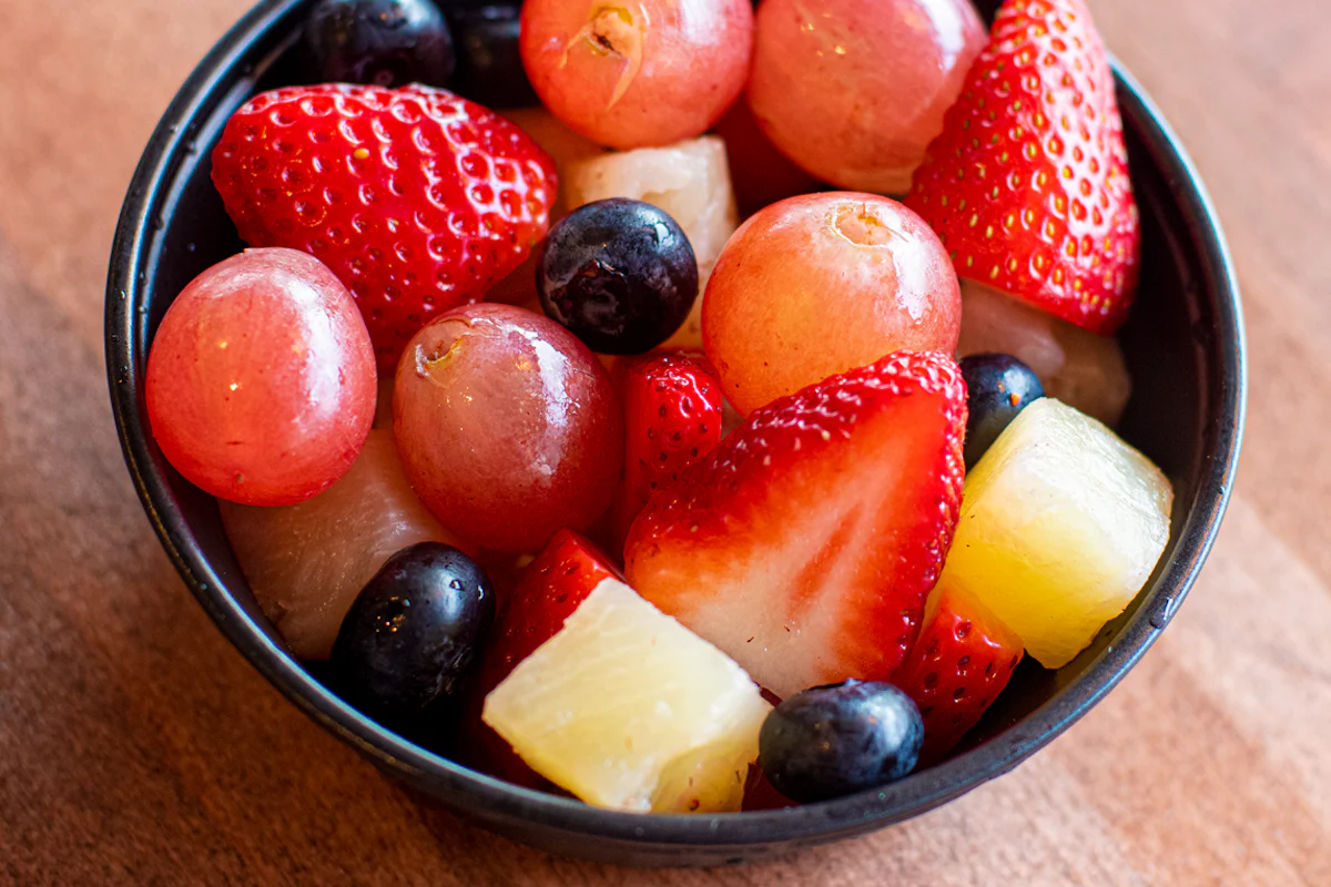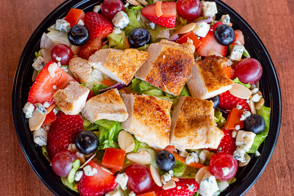 Salad greens, grilled chicken, tomato, strawberries, blueberries, red grapes, almonds, bleu cheese crumbles