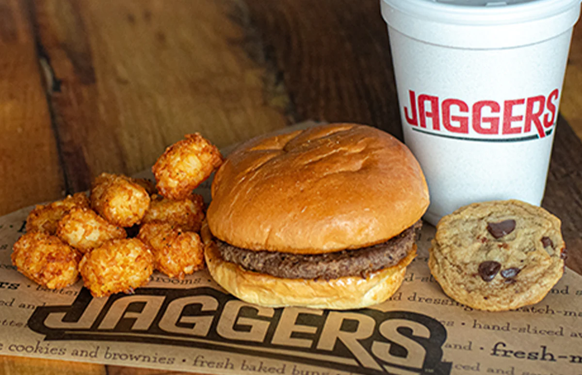 Two patties, American cheese, lettuce, tomato, onion, Jaggers sauce