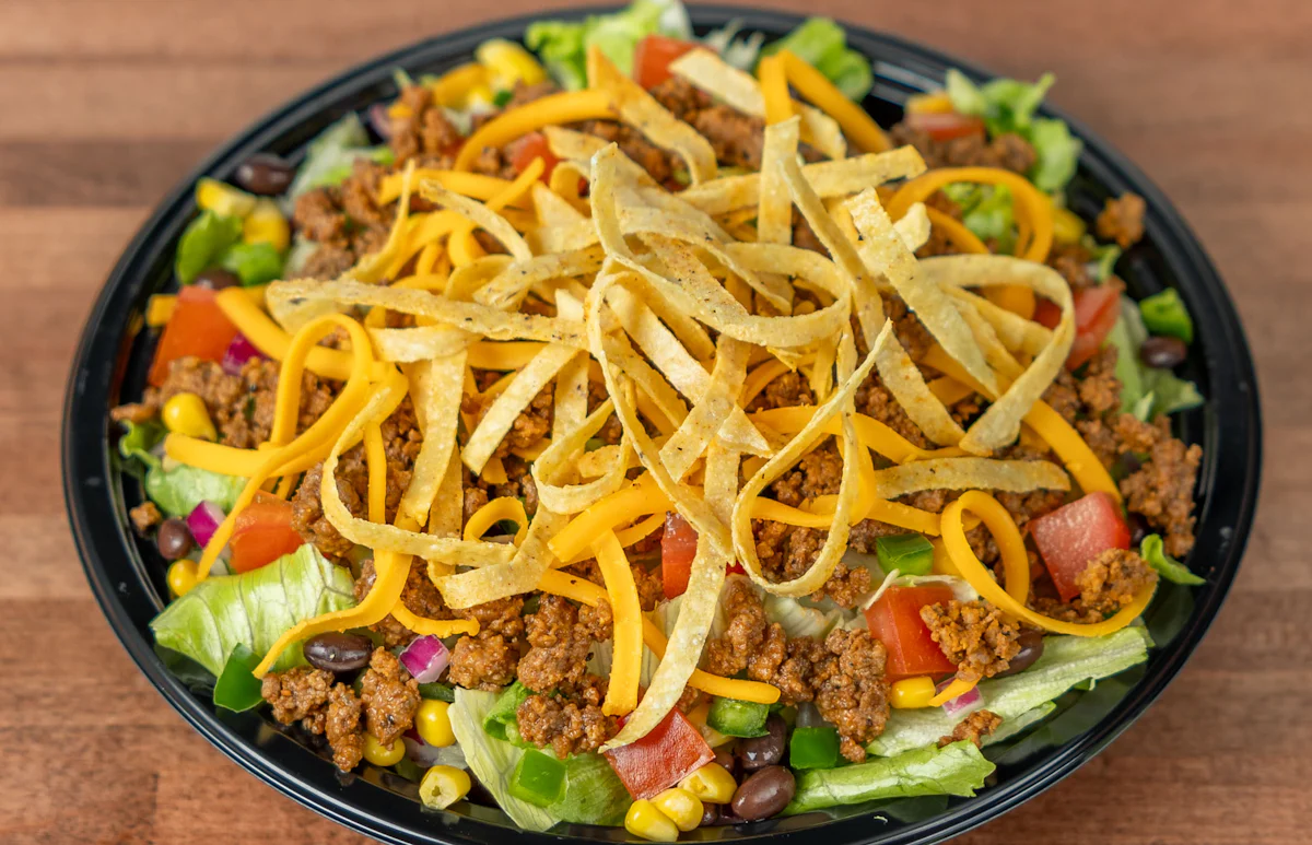 Taco-seasoned ground beef, salad greens, shredded cheddar, black beans, corn, tomato, red onion, jalapeno, crispy tortilla strips