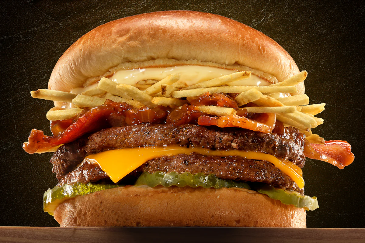Bourbon Mayo, Thick-Cut Bourbon Glazed Bacon, Pickles, Cheddar Cheese, Crunchy Potato Straws, Bourbon Onion Jam.