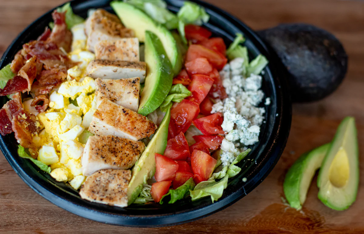 Salad greens, grilled chicken, tomato, egg, bacon, avocado, bleu cheese crumbles