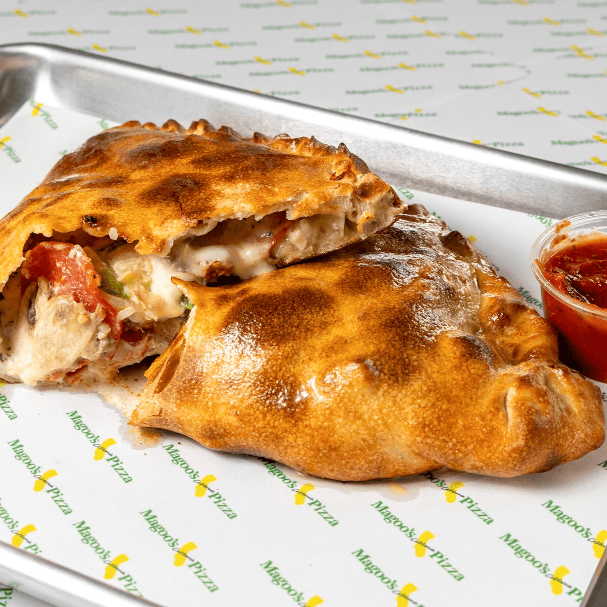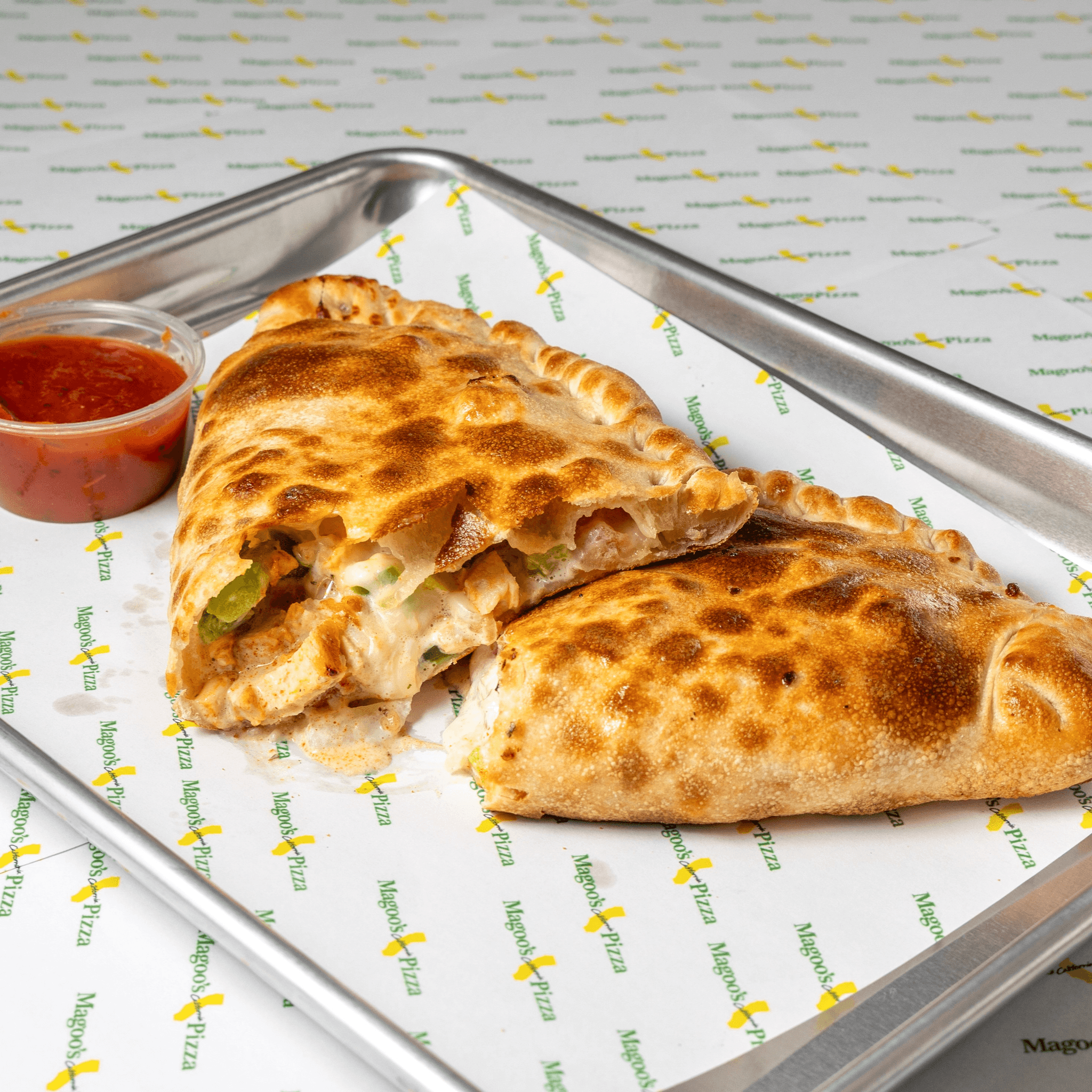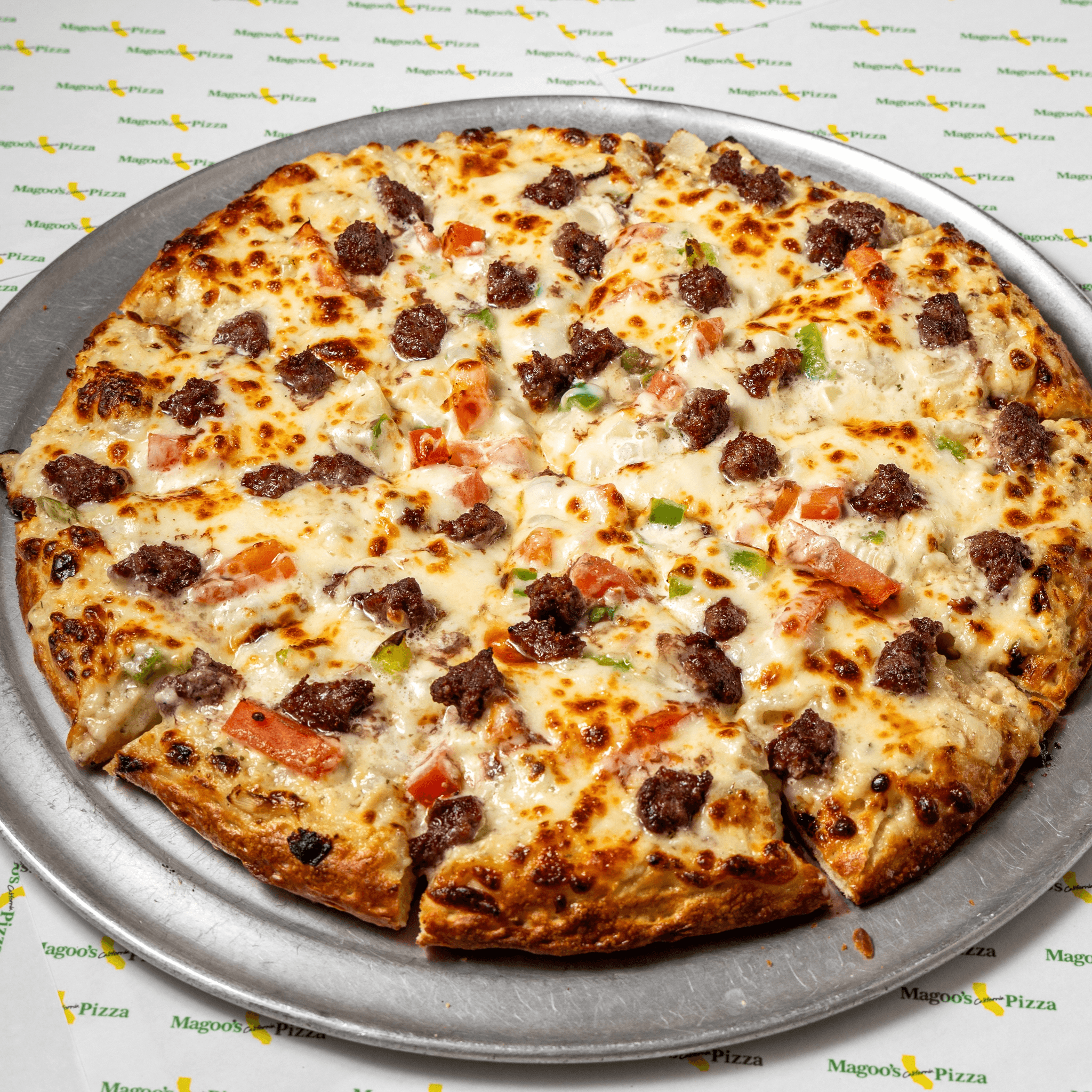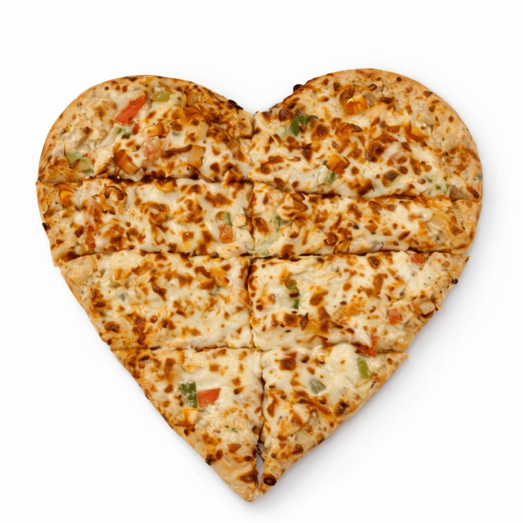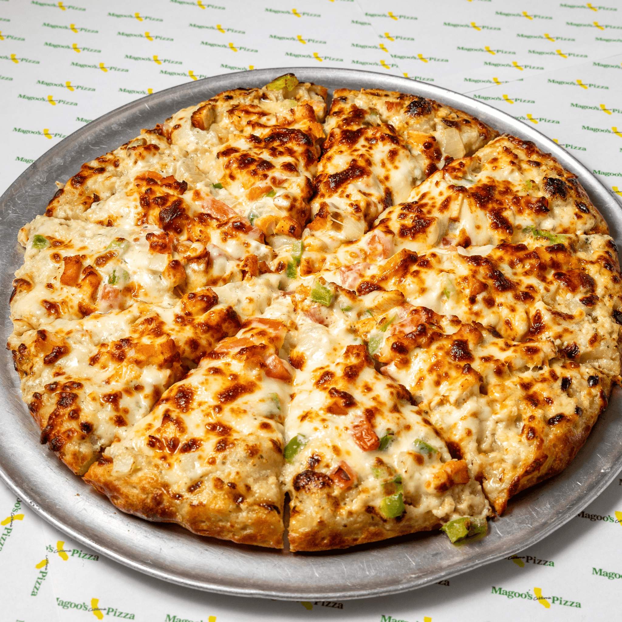 Marinated chicken, green peppers, tomatoes, onions, mozzarella, and creamy garlic sauce baked in a golden crust for a bold, savory flavor