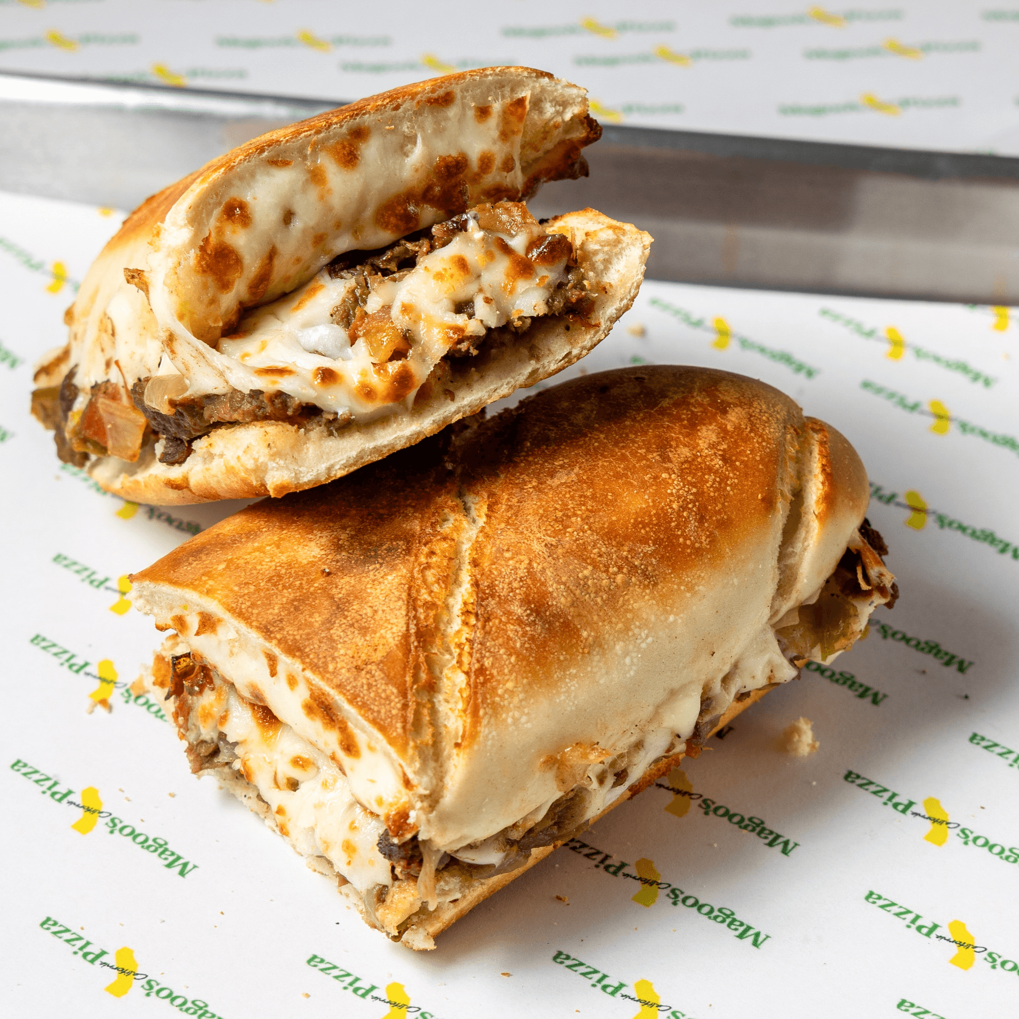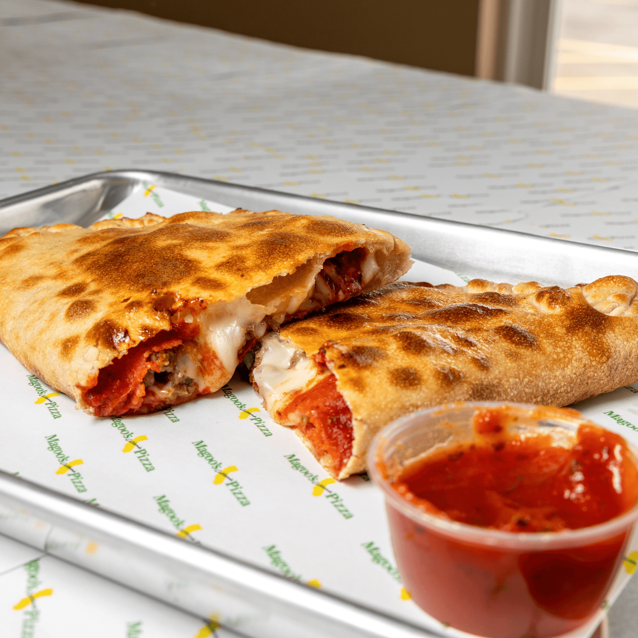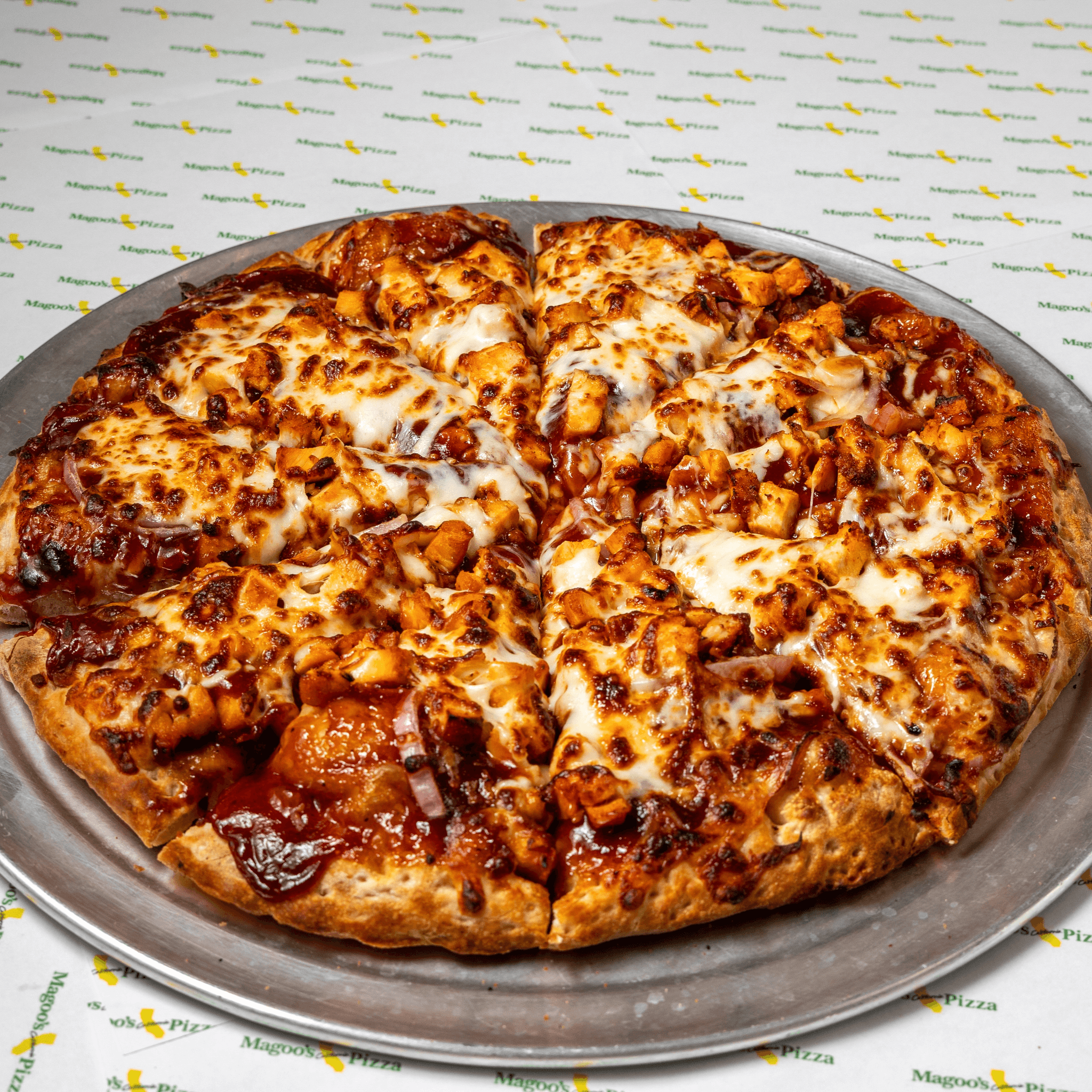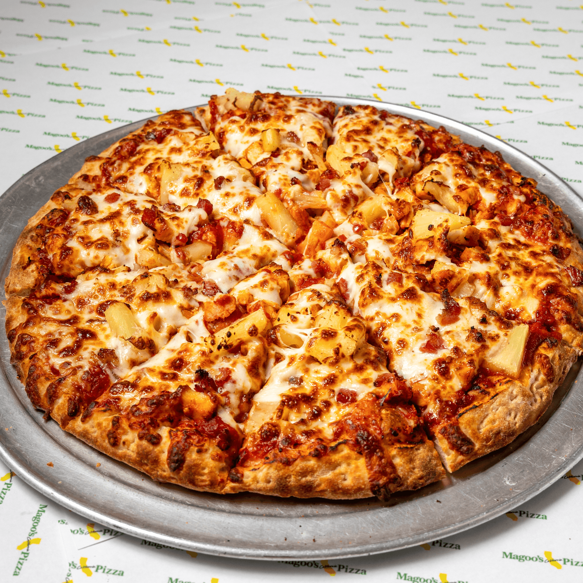 Marinated chicken, green peppers, tomatoes, onions, mozzarella, and creamy garlic sauce baked in a golden crust for a bold, savory flavor