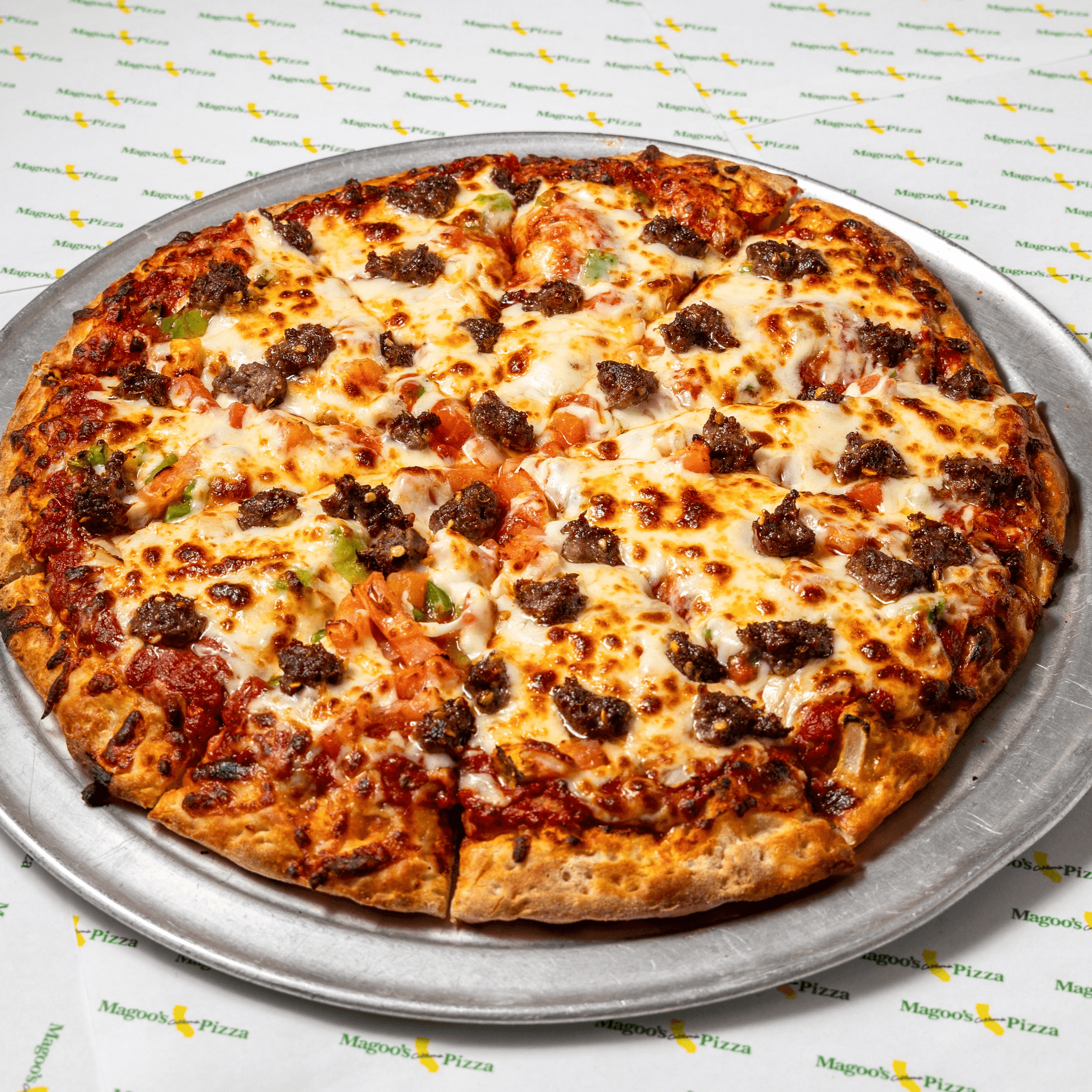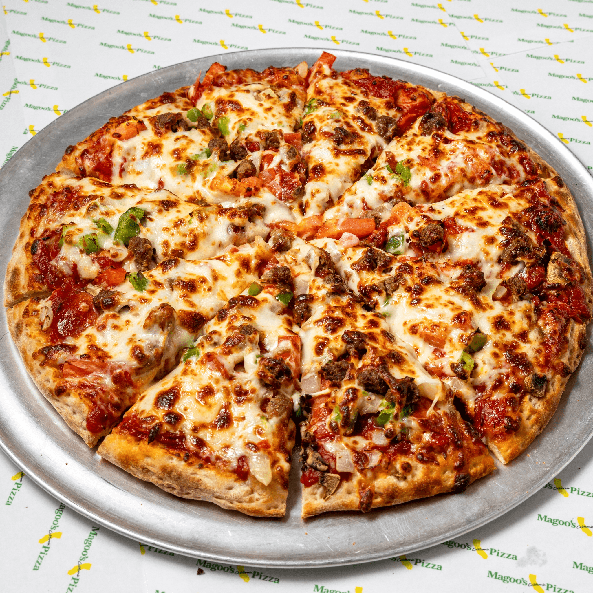 Pepperoni, sausage, mushrooms, onions, green peppers & tomatoes