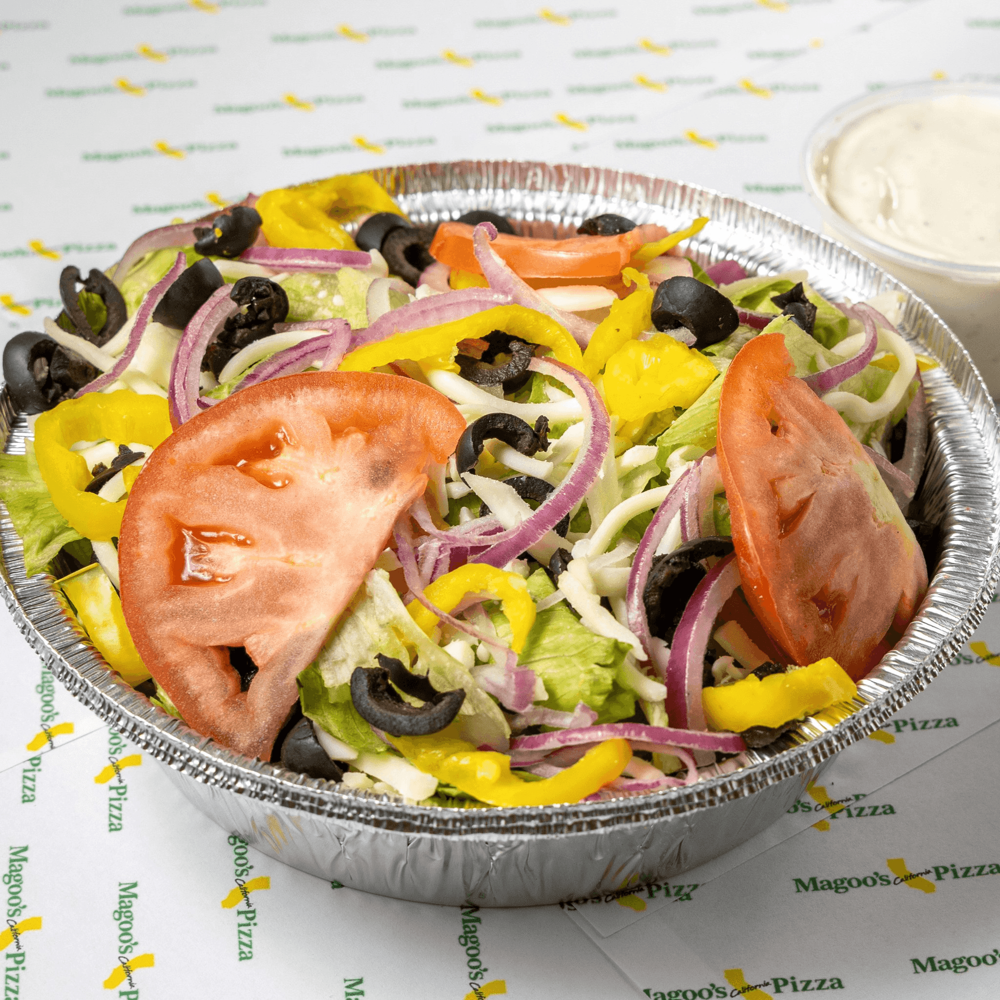 Lettuce, onions, tomatoes, banana pepper, black olives