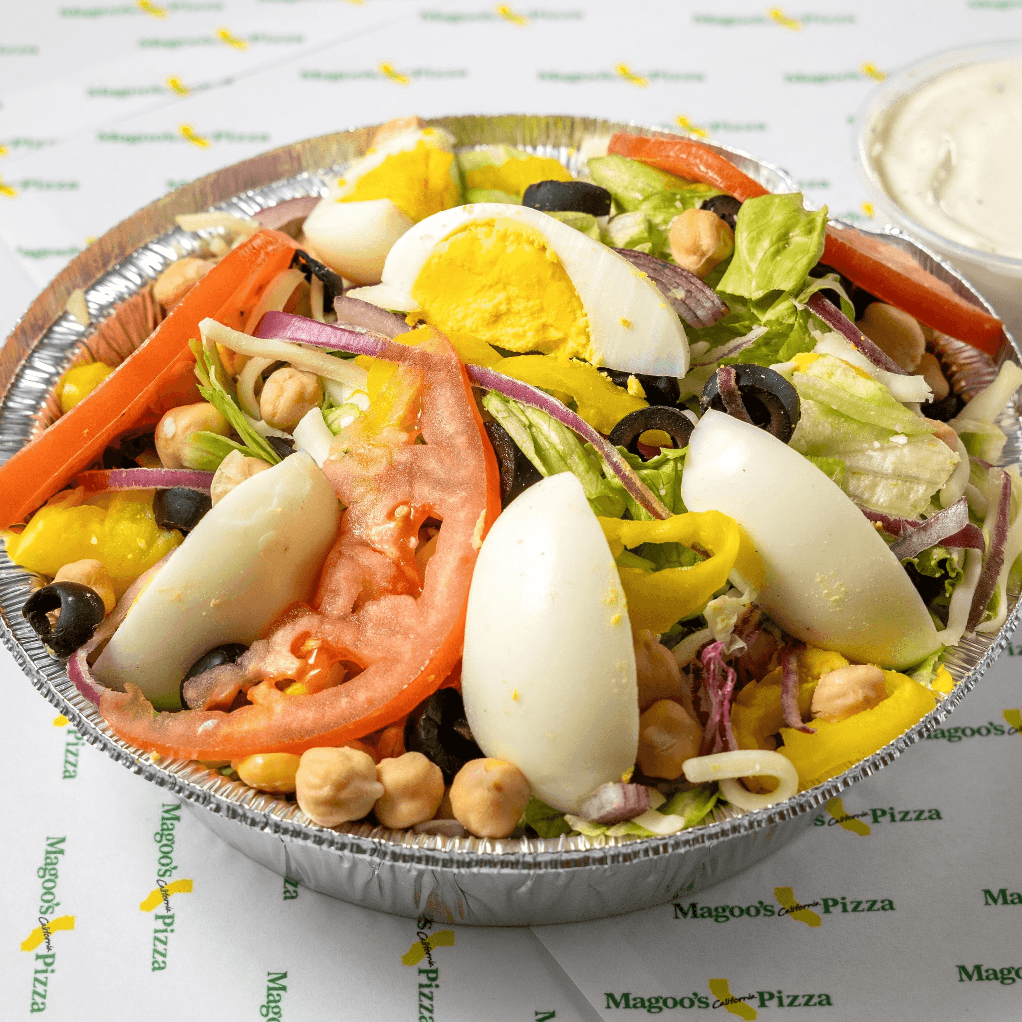 Garbanzo beans, eggs lettuce, onions, tomatoes, banana pepper, black olive